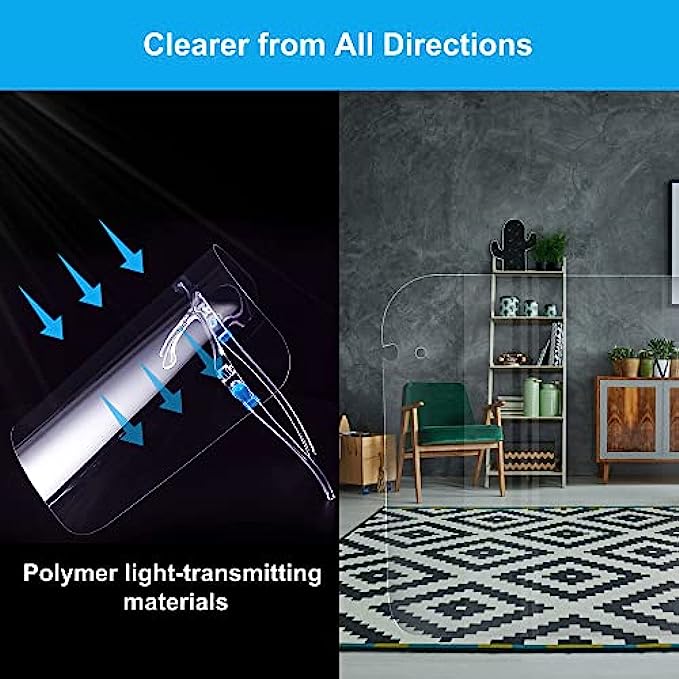 • 【10 PACK of face shield】Durable, lightweight, and comfortable protective face shields that are made with ultra-clear elastic and thick plastic. Each face shield contains an individual acrylic glasses frame, so you can get 10 complete Face shields with High quality glasses frames. When wearing glasses over your ears and on your nose bridge, this face shield protecting you will provide good protection as well as comfort. One size fits all and could be shared with families and friends.