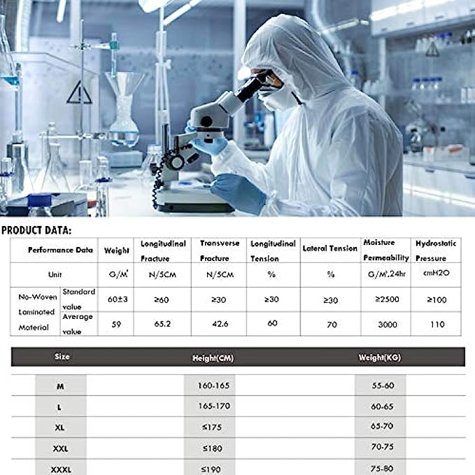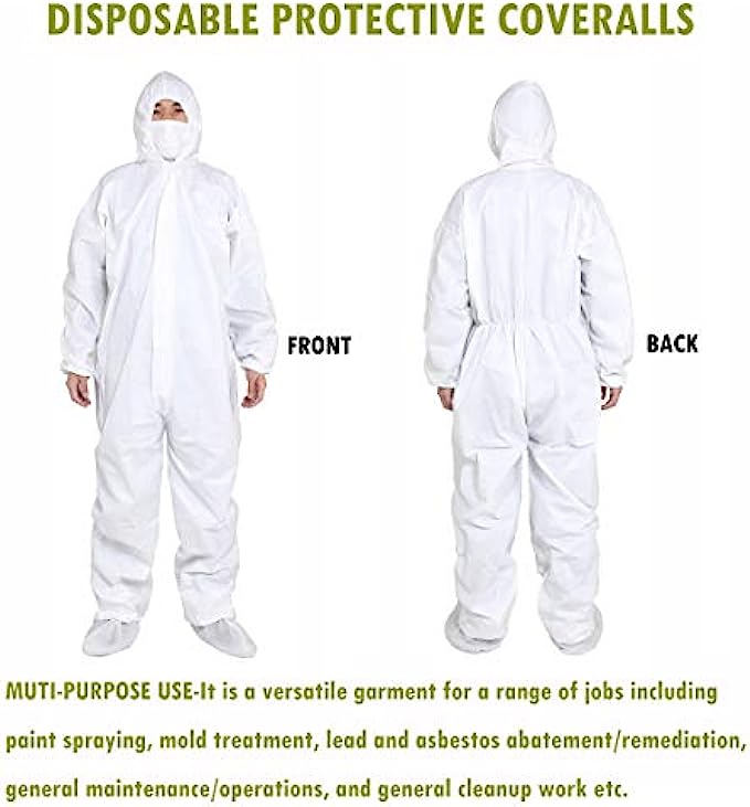 Elastic Imported Hand Wash Only ▷BREATHABLE-Made of high quality no-woven laminated materials.It is a breathable material that helps reduce heat build-up and promote comfortable wear. ▷LIGHTWEIGHT-Lightweigt&elastic design make you easy to work,and never limit your movement. ▷ABSOLUTE PROTECTION- High density materials of coverall fabric offers an inherent barrier to small size particles,include dry particulates and fluid.Anti-static coating on both sides helps reduce static build-up and prevent the risk of static discharge during use. ▷MUTI-PURPOSE USE-It is a versatile garment for a range of jobs including paint spraying, mold treatment, lead and asbestos abatement/remediation, general maintenance/operations, and general cleanup work etc.Not for chemical resistant. ▷ITEM INCLUDED-Pack of 5 coveralls.Foot cover not included.