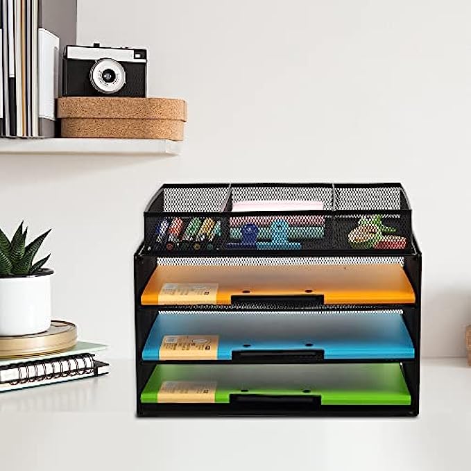 GDINDINFAN Paper Letter Tray Organizer, 3 Tier Mesh File Tray Desktop Paper Sorter with Drawer, Black