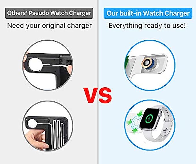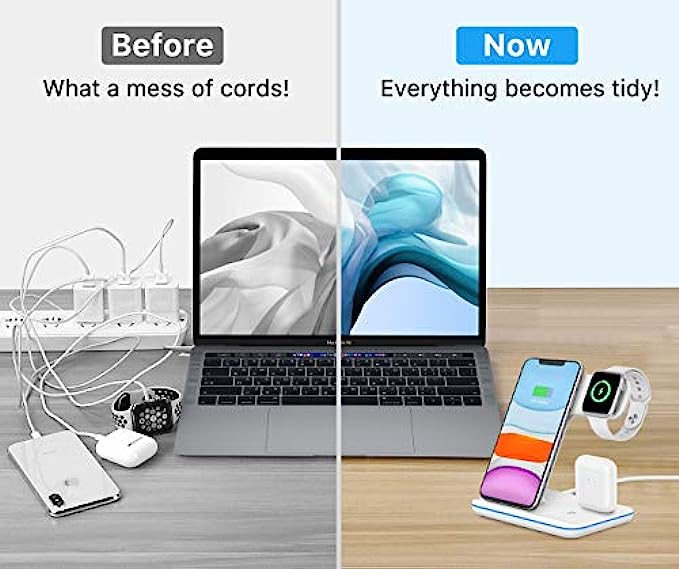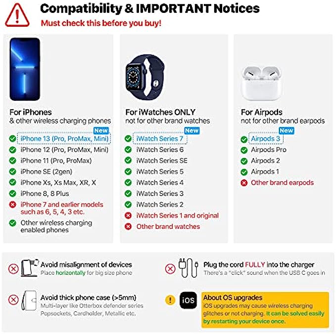 【Latest upgrade】Upgraded design and internal chip ensure safe and fast wireless charging. One charging device for iPhone, iWatch, and Airpods/Pro. Suitable for home and office usage. 【Universal Compatibility】 Qi-standard works with iPhone 13/13 Pro/13 Pro Max/13 Mini/12/12 Pro/12 Pro Max/12 Mini/11/11 Pro/11 Pro Max/XS/XR/XS MAX/X/8/8Plus, iWatch series 7/6/SE/5/4/3/2 (series 1/original not supported) and AirPods Pro/3/2/1, and other 100+ popular wireless charging phones. 【Fast Charging】 Support up to 10W fast wireless charging(7.5W for iPhones, 10W for Galaxy phones). Intelligent charging current control protects your device battery under fast charging. Place horizontally to enjoy videos while charging, or vertically for video conferencing or facial recognition. 【Ultra Safe】 Exclusive multi-functional intelligent protect technology provides temperature control, surge protection, short-circuit prevention, and more. For a better experience, please use the included adapters and avoiding thick protecting case (case thickness <5mm) 【What You Get】1 x charger, 1 x 18W adapter, 1 x cable, 1 x service card, Intoval 360-day warranty, and exceptional customer service.