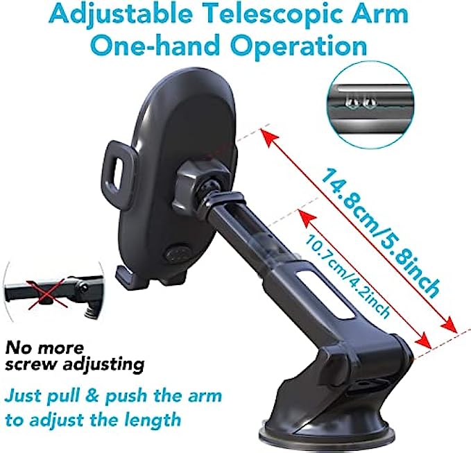 • Quick-release Button for Easy Phone Access: This hands-free Car Phone Mount with the One-click release button design, you can just press the button on the back of the holder to release the two sides grips, then snap device into place, your phone is good and secure. Easy to place and remove your smartphones with just one hand.