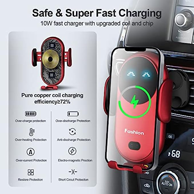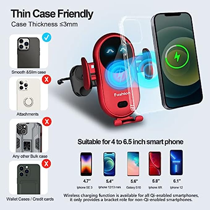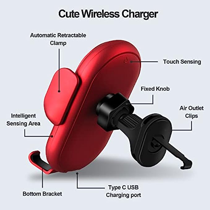 ?Infrared Auto Sensing: Put your phone close to the infrared auto-sensing area of the bracket, it will automatically open to its widest and pause for 2 s(put your phone in time), then automatically retract. When touch the button on the back of the mount, it will release and you can remove the phone. ?10W Fast Charging: The wireless charger adopts upgraded independent pure copper coil, high charging efficiency. Note: For fast charging mode requires a QC 3.0 car charger adapter (not included in the package) of 10W or more as its power supply. ?Upgraded Air Vent Clip: Retractable and 360° rotatable metal hooks, non-slip silicone cushion, high-quality knobs and user-friendly USB trunking design. Easy to install,applicable to more types of Air Vent. ?Cute Design: It designed like a happy healed fashion buddy with shinning eyes. Smiling all the time. The lovely wireless charger makes the boring driving journey more fun! ?Thoughtful Note: Low output voltage from the car's own USB port can cause the wireless charger to open &close constantly or not work. The typp-c port is not plugged in tightly, phone case is too thick or with magnetic/metal/foreign objects, it will cause the device to be unresponsive, slow to charge or hot. ?Safety Security: Wireless charger has overcharging protection, overheating protection, short circuit protection and electromagnetic protection.If the device is abnormal, it will automatically stop working, minimize driving hazards on the road. ?After-Sales Guarantee: We guarantee to provide you with the best quality and excellent service. If the product has any quality problem within 3 months, promise free replacement or refund. Please feel free to contact us for any questions.