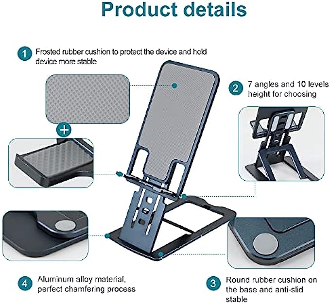 • ?[Height and Angle Adjustable] The adjustable phone stand is ergonomically designed. Ten heights and seven angles are easily adjustable, giving you the flexibility to customize the angle to find the most comfortable viewing angle. Reducing the frequency of looking down at your phone screen can help stabilize your posture and reduce stress on your neck and back.