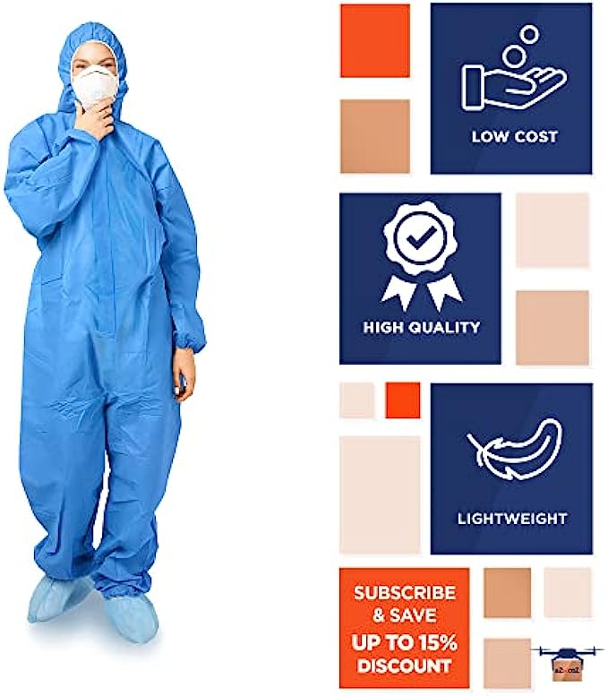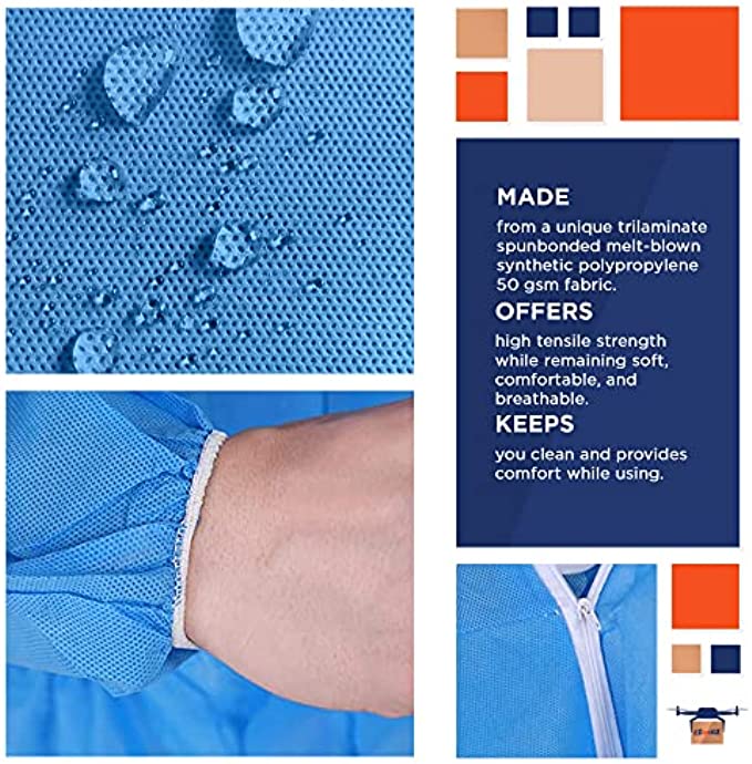 • PREMIUM QUALITY: These blue disposable overall are made from a unique trilaminate spunbonded melt-blown synthetic polypropylene 50 gsm fabric that offers high tensile strength while remaining soft, comfortable, and breathable. The material is low-linting and resistant to tears and punctures.