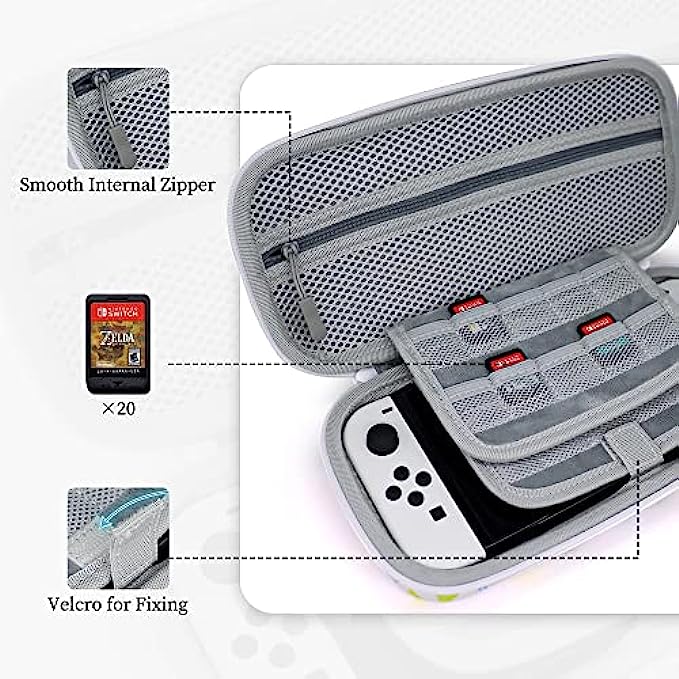 Island element design, a warm memory for AC fans. Also an ideal gift for family or friends, make them smile and make yourself happy. Specific design and perfect fit with all Switch familty(Switch / Switch Oled / Switch Lite). Two flaps on the middle can hold up to 20 game cards, it can also be super soft screen protectors. The bottom is designed with a double-layer hard shell, which perfectly protects the Switch from external shocks. All products are triple tested, plus we offer a five-year warranty.