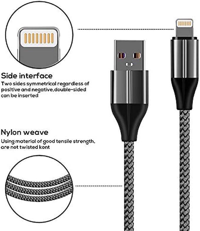 • 【Superb Performance】Phone cable with anti-resistant aluminum alloy connectors, high toughness PVC, tinned copper core cables to guarantee 100% compatibility to transmit data stably. Anti-overheating, support 2.4A current(Max) and the latest IOS system.