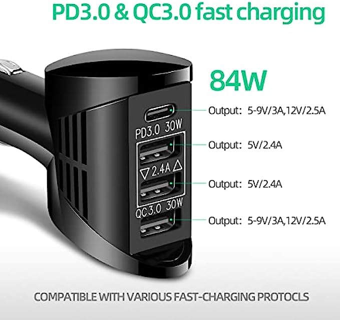 • 4 ports USB fast car charger output 84W(Max), PD3.0 port output 30W(Max), QC3.0 port output 30W(Max), 2.4A port output 12W(each port), each output port is independent, ensure that the output power will not decrease, ensure fast charging of each device.